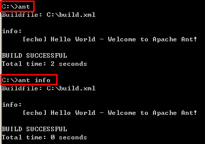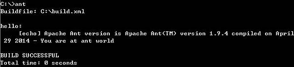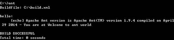 Buildfile: C:\Documents and Settings\paulstarchen\workspace\Test\build.xml clean: [mkdir] Created dir: C:\Documents and Settings\paulstarchen\workspace\Test\WebContent\WEB-INF\classes build: [javac] Compiling 1 source file to C:\Documents and Settings\paulstarchen\workspace\Test\WebContent\WEB-INF\classes BUILD SUCCESSFUL Total time: 4 seconds