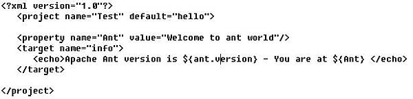 可自行定義property或是ant定義的property包含:ant.file、ant.version、basedir、ant.java.version、ant.project.name、ant.project.default-target、ant.project.invoked-targets、ant.core.lib、ant.home、ant.library.dir等